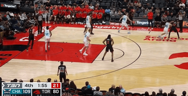 比賽第四節(jié),蜂領(lǐng)分雙方都黃蜂領(lǐng)先猛龍近30分,先猛雙方都換上替補(bǔ)陣容。換上