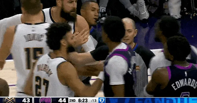 第二節(jié)比賽中,馬站瓦蘭和里德爆發(fā)沖突互噴垃圾話,中間約基奇立馬站中間拉開(kāi)兩人,拉開(kāi)兩人裁判回看后吹罰納茲-里德技術(shù)犯規(guī)。瓦蘭