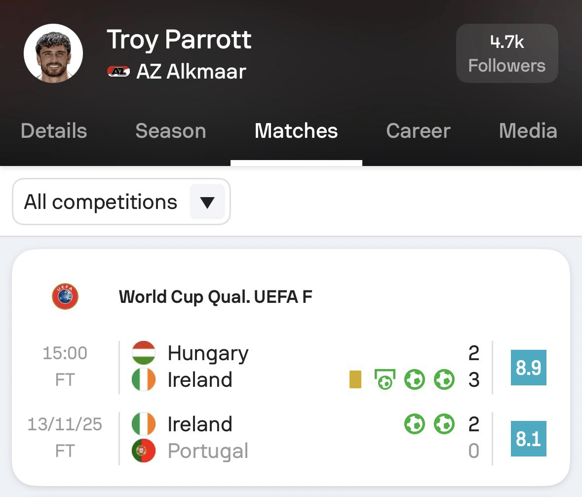 他在一周內(nèi)的2場(chǎng)比賽中包攬了愛(ài)爾蘭隊(duì)全部的5個(gè)進(jìn)球,成為愛(ài)爾蘭打進(jìn)附加賽的首功之臣。
