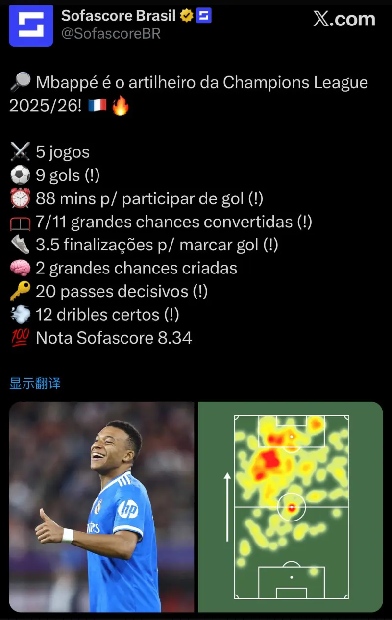 Sofascore:姆巴佩是歐冠 2025/26 賽季歐冠射手王!