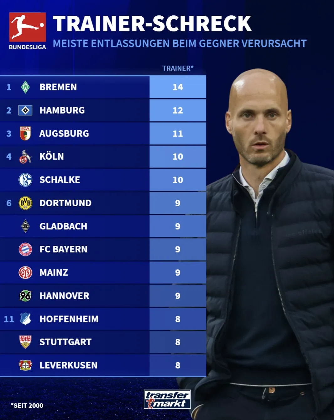 德轉(zhuǎn)統(tǒng)計(jì)了本世紀(jì)德甲直接導(dǎo)致教練下課的直接球隊(duì)排行榜。不萊梅、教練漢堡和奧格斯堡位居前三。下課行榜