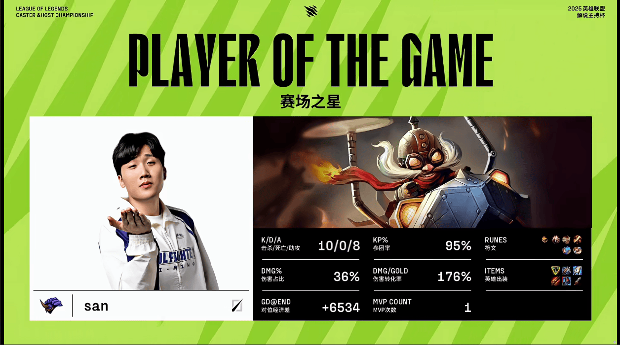 虎撲11月15日訊 在剛剛結束的RHPA對陣GBS的BO5比賽中,san飛機打出10/0/8戰(zhàn)績,戰(zhàn)績斬獲斬獲RHPA對陣GBS第一局MVP
