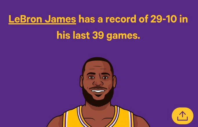 據(jù)湖媒BronMuse統(tǒng)計(jì),在詹姆斯出戰(zhàn)的近39場(chǎng)比賽中,球隊(duì)?wèi)?zhàn)績(jī)?yōu)?9勝10負(fù)。
