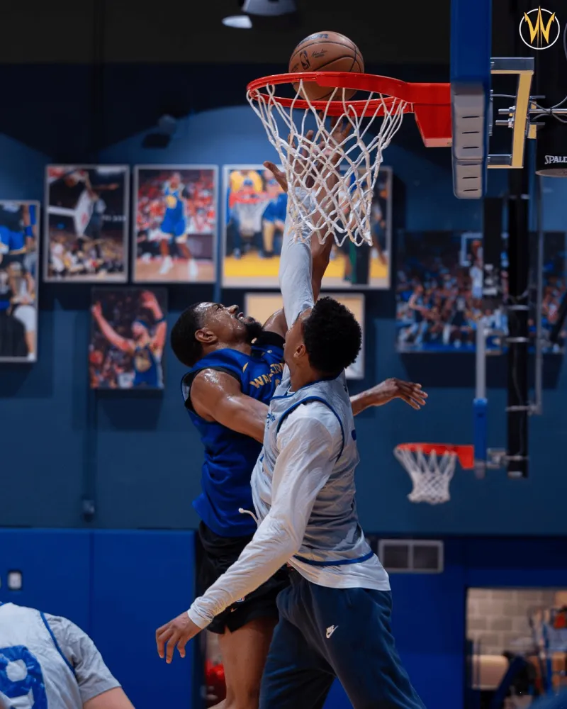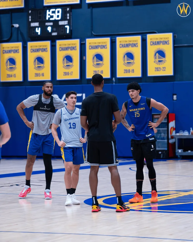 虎撲11月27日訊 勇士官方曬照:庫明加、梅爾頓、明加梅桑托斯和圣克魯茲勇士一起完成訓練。頓桑