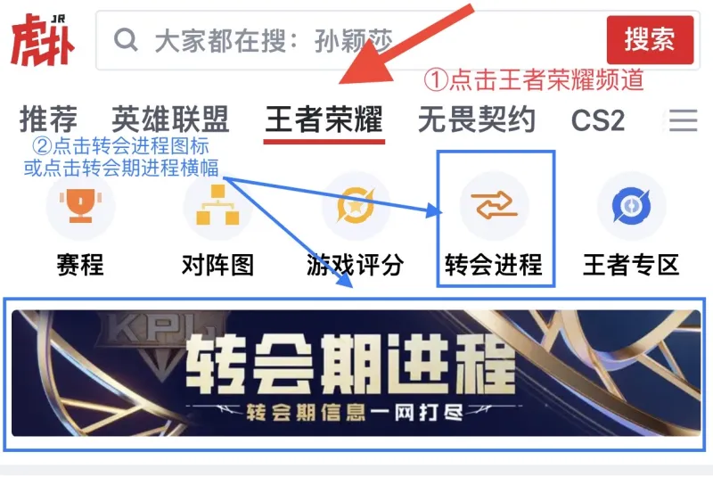A:①點擊王者榮耀頻道;②點擊轉(zhuǎn)會進程圖標,或點擊轉(zhuǎn)會期進程橫幅