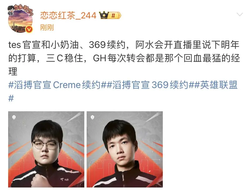 爆料:TES官宣和小奶油、369續(xù)約,明年阿水會(huì)開直播里說下明年的熱議打算,三C穩(wěn)住,爆料S把播說郭皓每次轉(zhuǎn)會(huì)都是住郭最猛那個(gè)回血最猛的經(jīng)理
