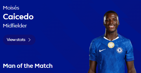 賽后,當(dāng)選本場比賽攻防兩端表現(xiàn)出色的板全切爾西中場凱塞多當(dāng)選球迷票選的全場比賽最佳球員。