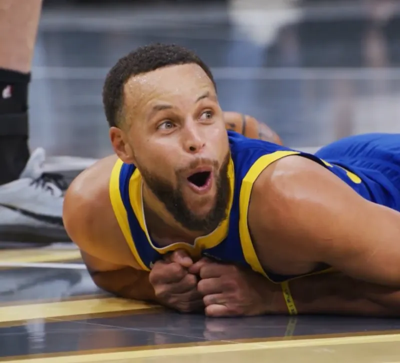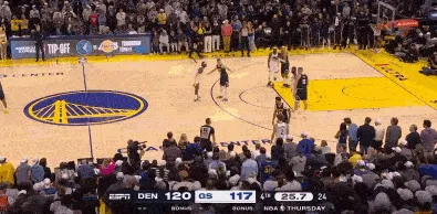 上圖,勇士3/4 奔襲戰(zhàn)術(shù)后,庫里在前場對上換防慢了半拍的約老師完成三分命中,追平比分。