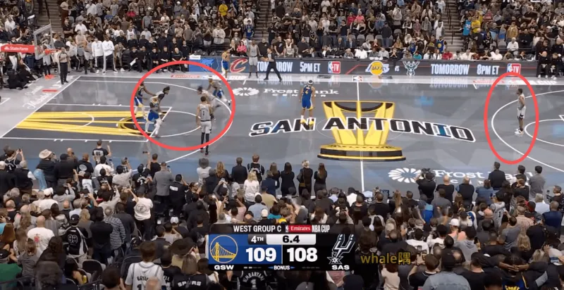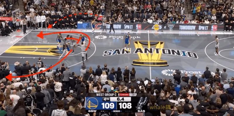 戰(zhàn)術(shù)發(fā)起的第一步:馬刺主教練米奇對這一戰(zhàn)術(shù)做了微調(diào)。原戰(zhàn)術(shù)大多時候,罰球線的無球跑位是誘餌,后場球員才是主攻。這一次,米奇對戰(zhàn)術(shù)做了調(diào)整——第一步想打文班的掛掩護空接。戰(zhàn)術(shù):先是瓦塞爾自右側(cè)向左側(cè)底角跑動,清空弧頂區(qū)域。隨后,罰球線的卡斯爾上提掩護文班空切籃下。這一步,勇士只要換防出現(xiàn)細節(jié)的失誤,文班便能接巴恩斯邊線發(fā)球完成籃下得分。