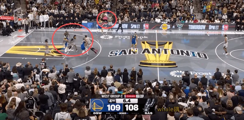 回到這場比賽最后6.4秒,暫?;貋砗?,馬刺球員上場后,就完成了“3/4場奔襲”戰(zhàn)術(shù)的標志性落位——罰球區(qū)域的三人分散站位;??怂箘t在后3/4場落位,作為奔襲人。
