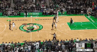 自史蒂文斯執(zhí)教凱爾特人隊開始,即便教練更替,每到關(guān)鍵時刻,凱爾特人都會用該戰(zhàn)術(shù)為塔圖姆制造最后一攻的機會。上圖,戰(zhàn)術(shù)創(chuàng)造出一大片防守真空地帶后,塔圖姆四分之三場位置加速奔襲,接隊友傳球后,扣籃打進關(guān)鍵球。