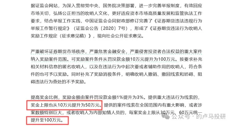 如果是真賬戶,那就恭喜了,他公開(kāi)股票代碼,公布操作行為,涉嫌召集散戶違規(guī)跟隨,散布虛假信息…等惡劣行徑。9月30日,中國(guó)證監(jiān)會(huì)發(fā)布《證券期貨違法行為吹哨人獎(jiǎng)勵(lì)工作規(guī)定》,《規(guī)定》大幅度提高了獎(jiǎng)勵(lì)標(biāo)準(zhǔn),其中涉及大案要案獎(jiǎng)金上限提升至100萬(wàn)元。也就是說(shuō)大家收集證據(jù)舉報(bào)他,不光可以獲得高額獎(jiǎng)金,還能把他送進(jìn)去。
