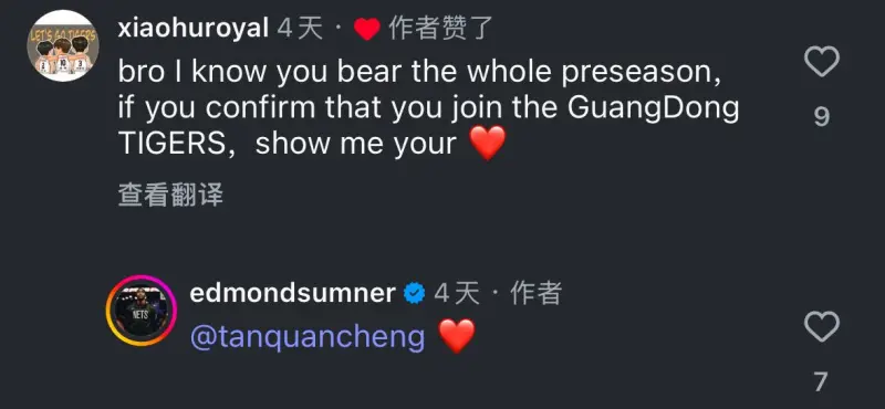 薩姆納則回復(fù)了一個愛心表情。社媒