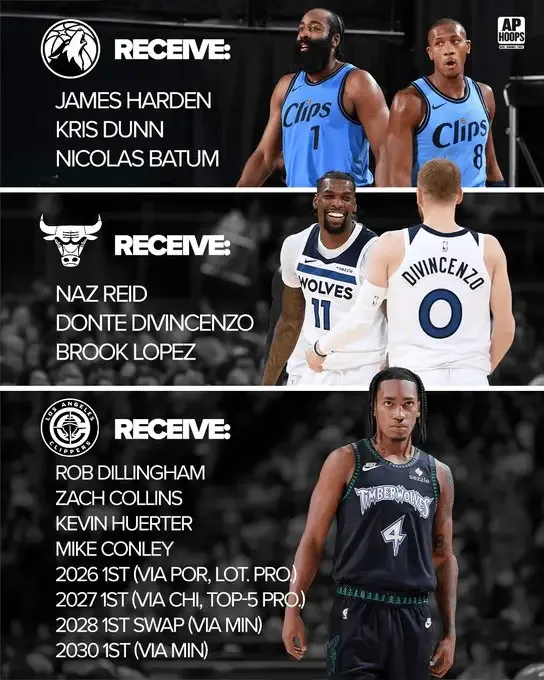 美媒APHoops今早曬出了快船、森林狼和公牛的三方交易模擬圖。森林狼可以得到哈登、鄧恩、巴圖姆。公牛得到里德、迪溫琴佐、布魯克-洛佩茲。快船得到迪林厄姆、扎克-柯林斯、赫爾特、康利、26,27,30年首輪以及28年首輪互換。
