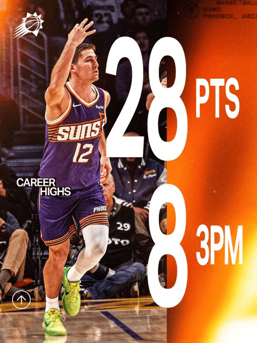 本場(chǎng)比賽,場(chǎng)分太陽(yáng)球員科林-吉萊斯皮出戰(zhàn)33分鐘,得分19投10中,生涯其中三分球14投8中,新高得到28分4籃板5助攻2搶斷。流言萊