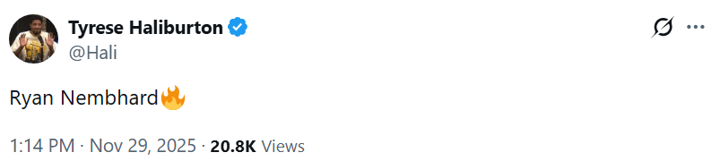 下半場(chǎng)比賽中,步行者球員泰瑞斯-哈利伯頓更推,并寫道: