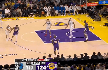 虎撲11月29日訊 NBA杯小組賽,湖人對陣獨行俠的詹姆鐘領比賽正在進行中。