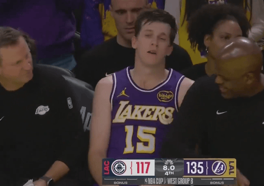 本場比賽,湖人球員奧斯汀-里夫斯出戰(zhàn)35分鐘,16投11中,其中三分球4投2中,罰球7投7中,得到31分9籃板3助攻3搶斷。