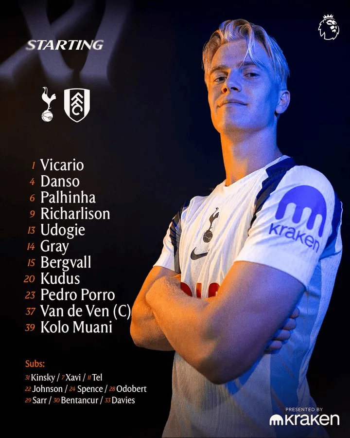 熱刺首發(fā):1-維卡里奧、4-丹索、13-烏多吉、23-波羅、37-范德芬、6-帕利尼亞、14-格雷、15-貝里瓦爾、9-里沙利松、20-庫杜斯、39-穆阿尼