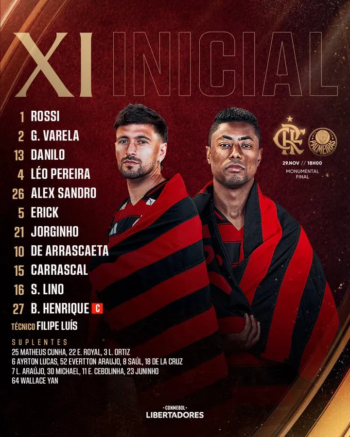 虎撲11月30日訊 南美解放者杯決賽,帕爾梅拉斯對(duì)陣弗拉門戈,賽前雙方公布首發(fā)名單: