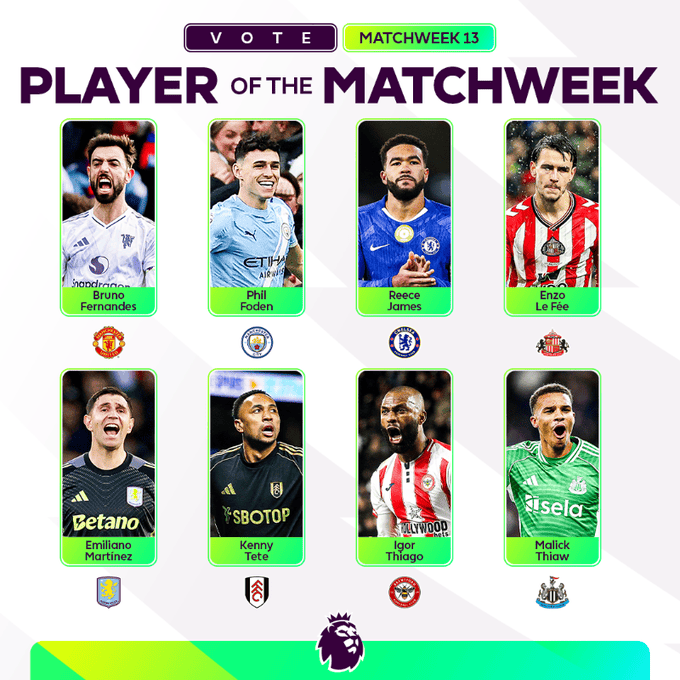 虎撲12月01日訊 英超官方公布第13輪的最佳球員候選名單。