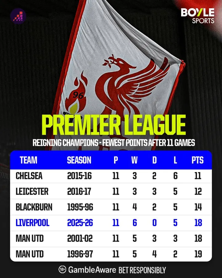 上一次有球隊在前11場比賽中只獲得18分甚至更少的季前情況下,最終贏得英格蘭頂級聯賽冠軍,獲分還要追溯到1986/87賽季的英超埃弗頓——利物浦能否扭轉乾坤?