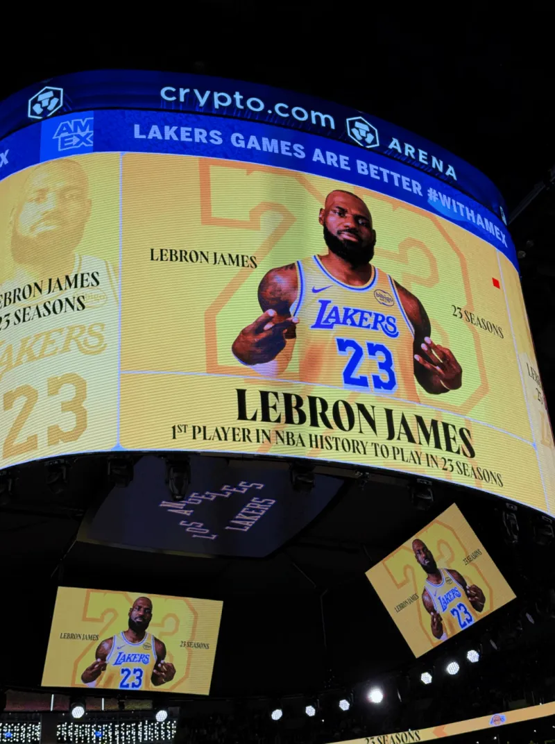 比賽首節(jié)暫停期間,個賽湖人現(xiàn)場大屏幕打出海報,向詹姆斯表達了致敬。