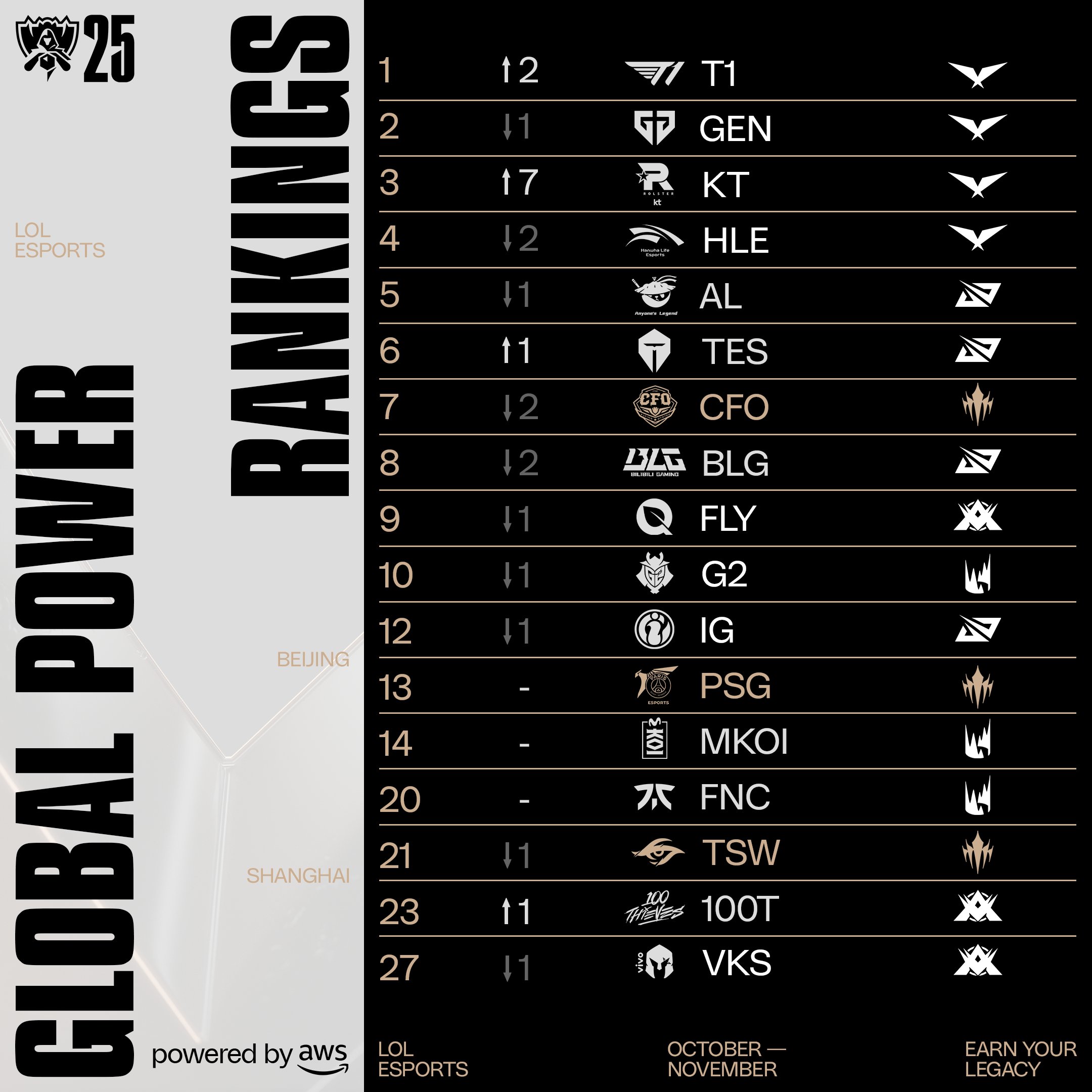 虎撲11月10日訊 今日賽事官方公布全球戰(zhàn)隊(duì)實(shí)力排行榜,T1排名第一,事官LCK賽區(qū)包攬前四,球戰(zhàn)LPL賽區(qū)AL排名最高