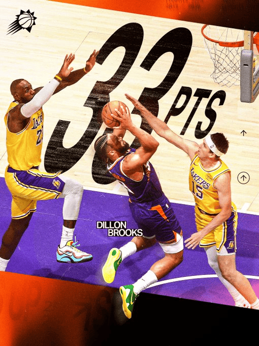 本場比賽,太陽球員狄龍-布魯克斯出戰(zhàn)32分鐘,26投15中,其中三分球7投2中,罰球3投1中,得到33分2籃板2助攻1搶斷。