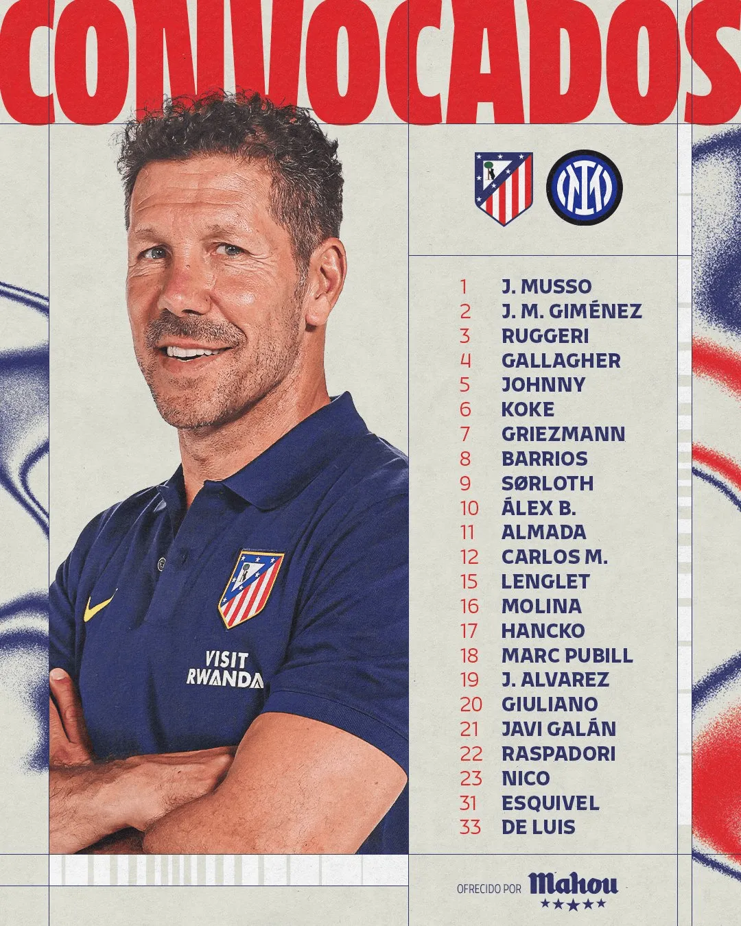 虎撲11月26日訊 北京時(shí)間11月27日凌晨4時(shí),2025-26賽季歐冠聯(lián)賽階段第5輪,國米歸略馬德里競(jìng)技坐鎮(zhèn)大都會(huì)球場(chǎng)迎戰(zhàn)國際米蘭。大名單賽前馬競(jìng)公布了本場(chǎng)比賽的西蒙大名單。