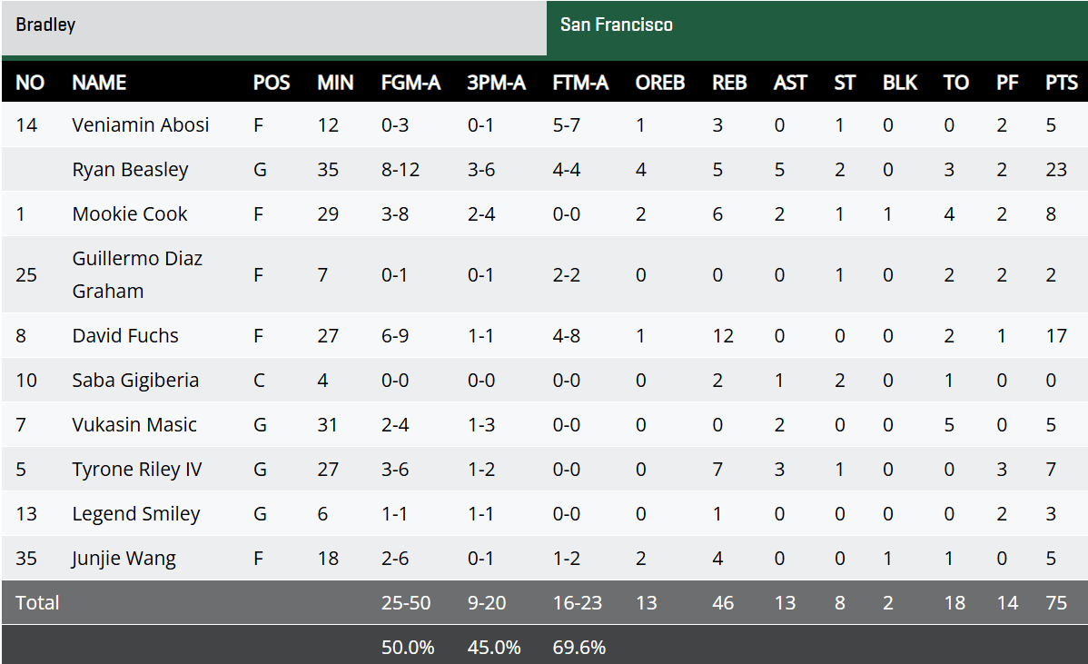 虎撲11月16日訊 今日NCAA常規(guī)賽:舊金山大學(xué)75-64戰(zhàn)勝布拉德利大學(xué)。