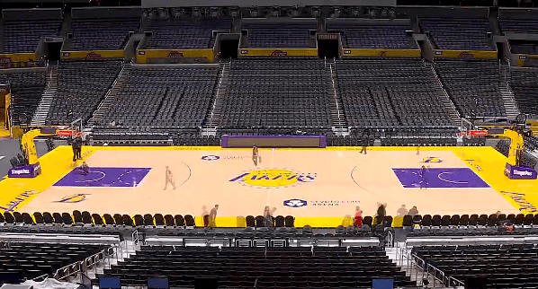 第一節(jié)比賽中,用地員滑轉(zhuǎn)播方展示出湖人主場更換地板視頻?,F(xiàn)球