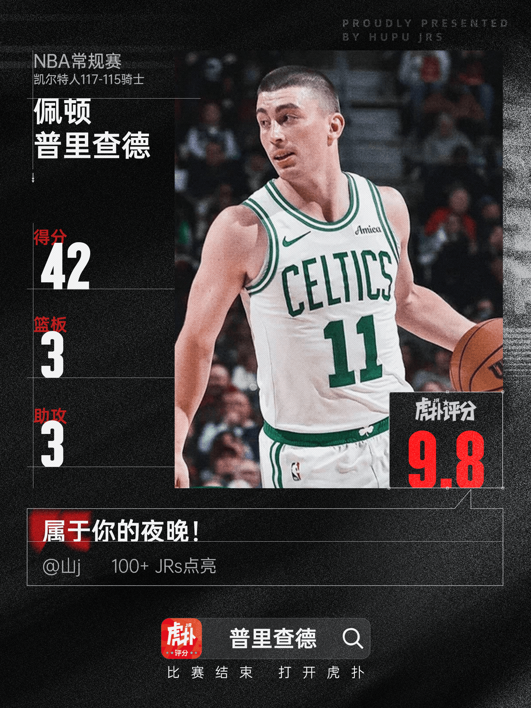本場(chǎng)比賽,中得助攻凱爾特人球員佩頓-普里查德出戰(zhàn)30分鐘,到分22投15中,籃板其中三分球11投6中,賽季罰球6投6中,新高得到42分3籃板3助攻。普里