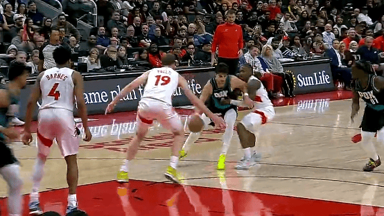 第四節(jié)比賽中,落后阿夫迪亞關(guān)鍵回合被吹進(jìn)攻犯規(guī),猛龍開拓者還剩40秒落后猛龍2分。迪亞