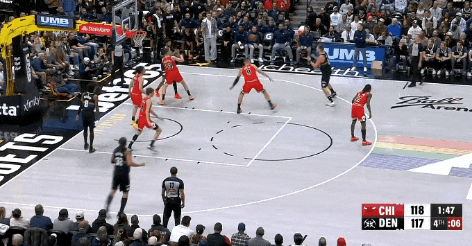 約基奇關(guān)鍵時(shí)刻頂投三分砍下32分,掘金剩2分鐘反超公牛2分