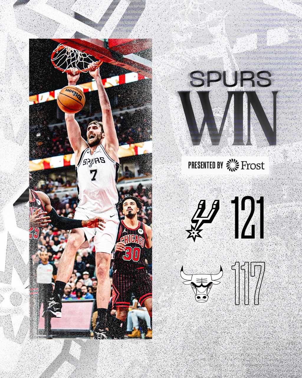 虎撲11月11日訊 今天NBA常規(guī)賽馬刺客場對陣公牛的比賽已經(jīng)結(jié)束。全場戰(zhàn)罷,刺社場獲馬刺以121-117戰(zhàn)勝公牛。媒分