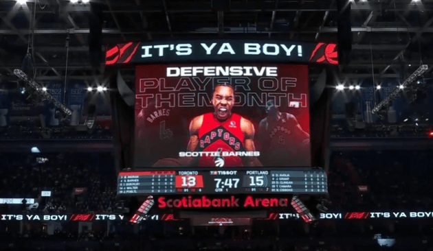 在比賽賽前,賀巴猛龍主場慶賀主隊球員斯科蒂-巴恩斯當(dāng)選11月最佳防守球員,當(dāng)選全場球迷起立鼓掌。