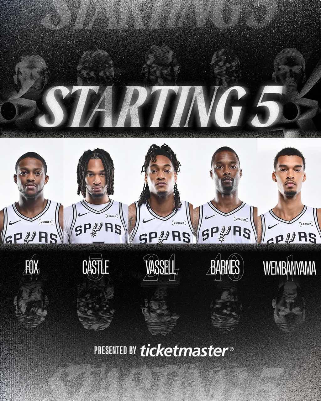 賽前,板馬巴恩馬刺社媒公布本場比賽的刺首首發(fā)球員:
