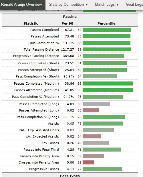 列出巴薩主力阿勞霍、庫(kù)巴西與知名中衛(wèi)范戴克、科納特、薩利巴、加布里埃爾、懷森、格伊、塔、施洛特貝克、范德文、羅梅羅的出球數(shù)據(jù)