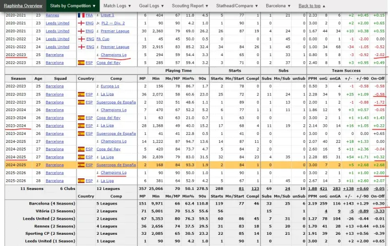 拉菲在場(chǎng)進(jìn)球數(shù)22-23-0.58,23-24+0.22,24-25+0.32,巴薩總+0.30。拉菲在西超杯、西甲次輪國(guó)家德比都梅開(kāi)二度獲評(píng)mvp。我認(rèn)為他表現(xiàn)得并不夠好,但他也配得上這些mvp,因?yàn)檫@就是足球的運(yùn)行機(jī)制。