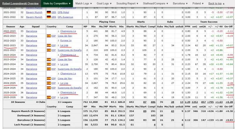 萊萬(wàn)在場(chǎng)進(jìn)球數(shù)據(jù)24-25-0.48巴薩生涯總+0.03,他真正的改變是歐冠從前兩年災(zāi)難級(jí)別的-1表現(xiàn)變成相當(dāng)不錯(cuò)的+1。