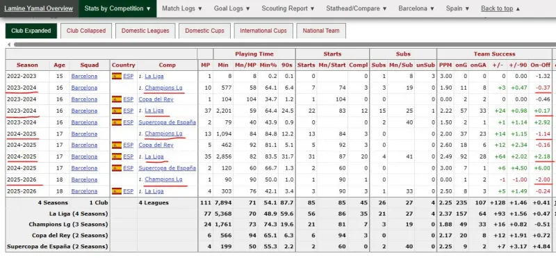 他在聯(lián)賽里+2的在場(chǎng)進(jìn)球數(shù),以及在歐冠被重點(diǎn)盯防后下降為負(fù)的影響力,才是歐冠失利的原因。鋒線是亞馬爾扛起來(lái)的蹺蹺板,他能壓住,隊(duì)友能看起來(lái)高,他壓不住,隊(duì)友就原形畢露。