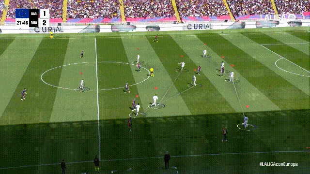 45+3分鐘庫(kù)巴西點(diǎn)給德容 德容判斷落點(diǎn)失誤 停球逆足不能傳左路 刀山球給庫(kù)巴西 庫(kù)巴西直傳馬丁沒(méi)拿到纏斗 德容搶斷分邊 拉菲橫傳被斷