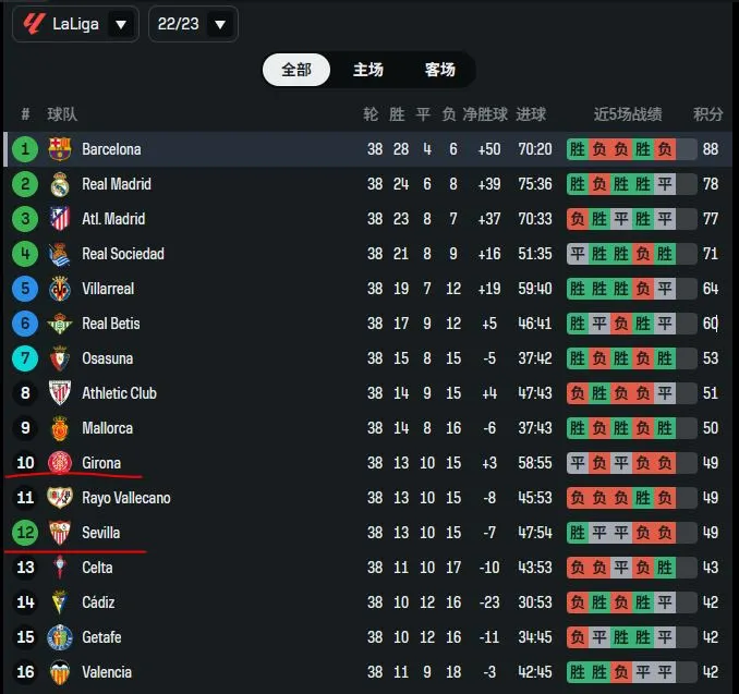 我要糾正你幾件事,一.赫羅納22-23才是升班馬,他排第10,勁旅塞維利亞是排第12