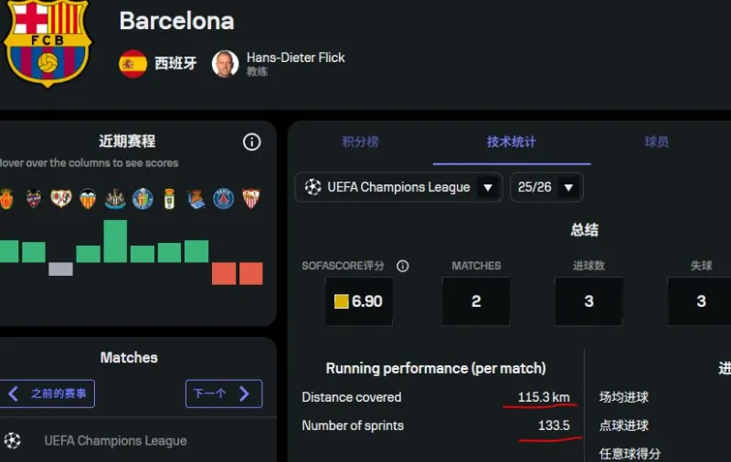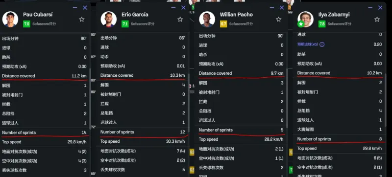 看看巴薩負(fù)于巴黎一役中,雙中衛(wèi)雙倍于對(duì)手的沖刺次數(shù),記住多出的這十幾次,后面要考到。