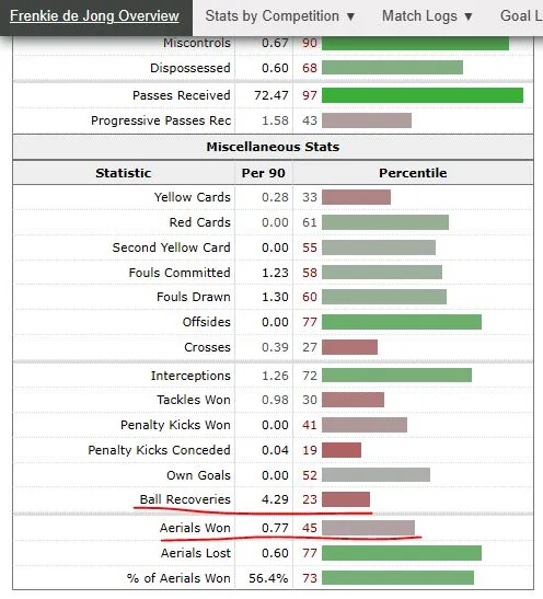 德容的問(wèn)題在于雖然他防守不行,但是他進(jìn)攻也不行。雖然推進(jìn)組織是長(zhǎng)項(xiàng),但巴薩多的是比他更擅長(zhǎng)推進(jìn)組織的人,還都能貢獻(xiàn)更好的最后一傳。德容最好的表現(xiàn)總是觸球多、傳球多、丟失球權(quán)少,可是他處理球總是回傳,短傳又經(jīng)常傳刀山球,而隊(duì)友丟球卻不會(huì)計(jì)入德容的丟失球權(quán)。