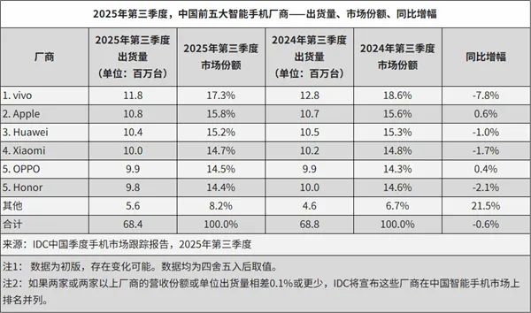 來(lái)源:微博虎撲10月15日訊 據(jù)IDC中國(guó)季度手機(jī)市場(chǎng)跟蹤報(bào)告顯示,2025年Q3中國(guó)智能手機(jī)總出貨量為6840萬(wàn)臺(tái),同比下降0.6%,市場(chǎng)整體增長(zhǎng)乏力。