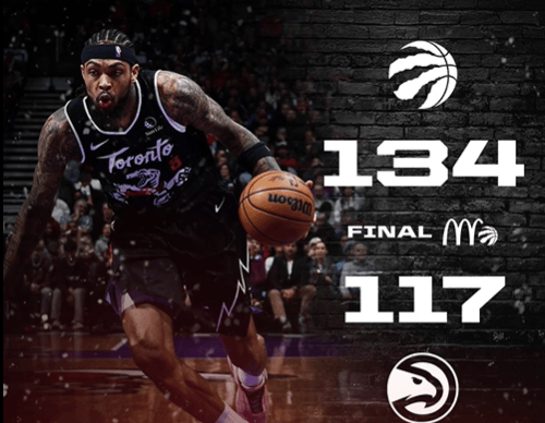 虎撲01月04日訊 今天NBA常規(guī)賽猛龍主場對陣?yán)销椀谋荣愐呀?jīng)結(jié)束。全場戰(zhàn)罷,走老猛龍以134-117戰(zhàn)勝老鷹。鷹繼